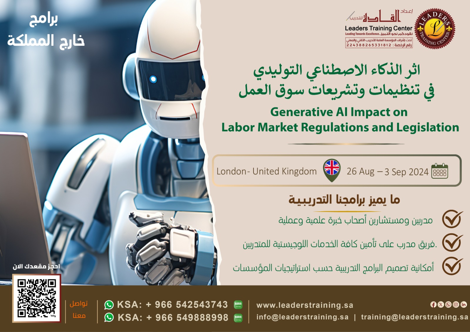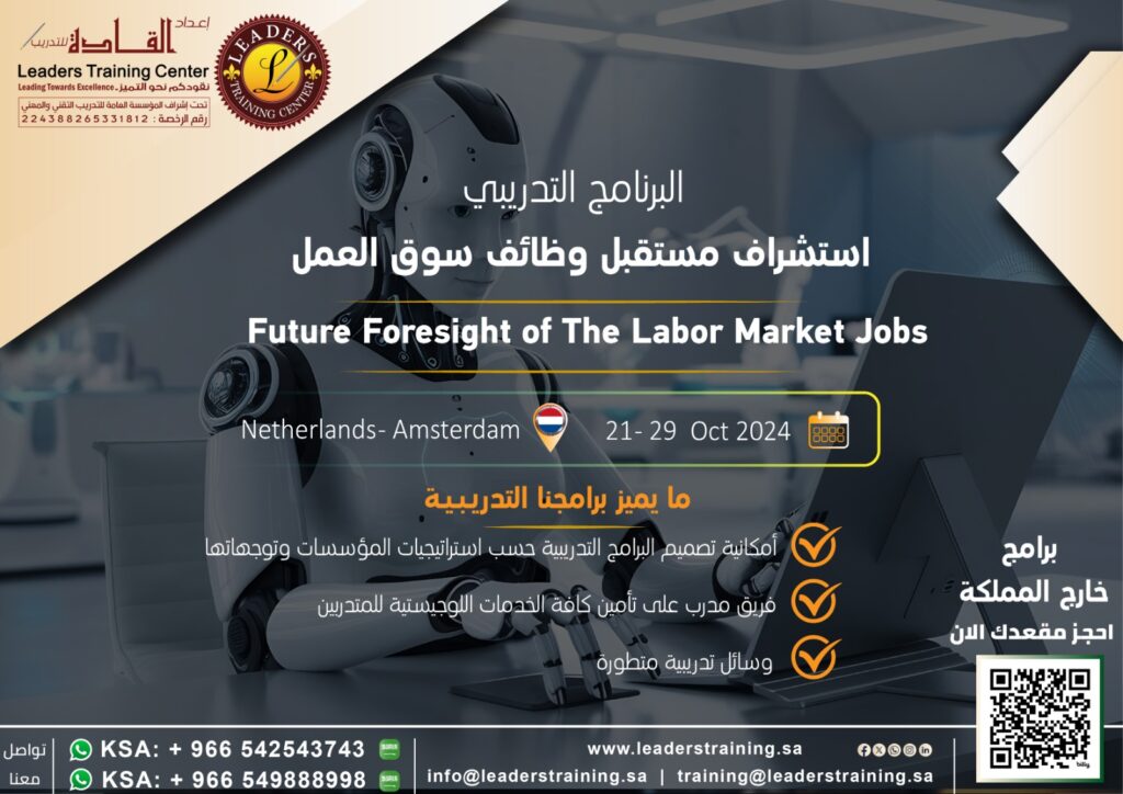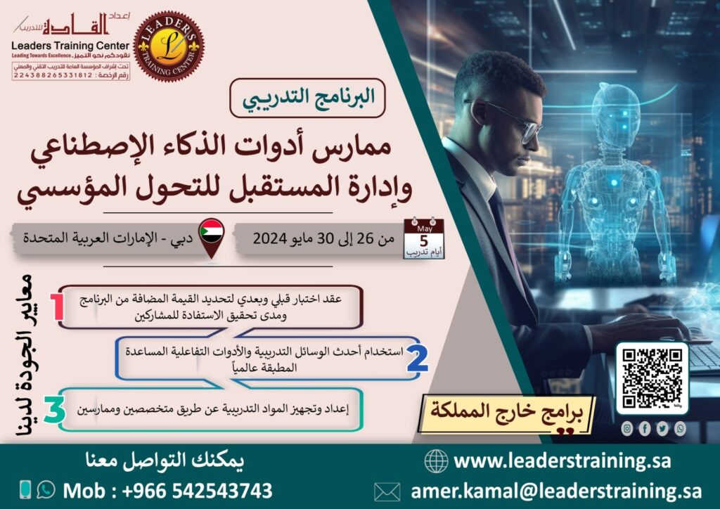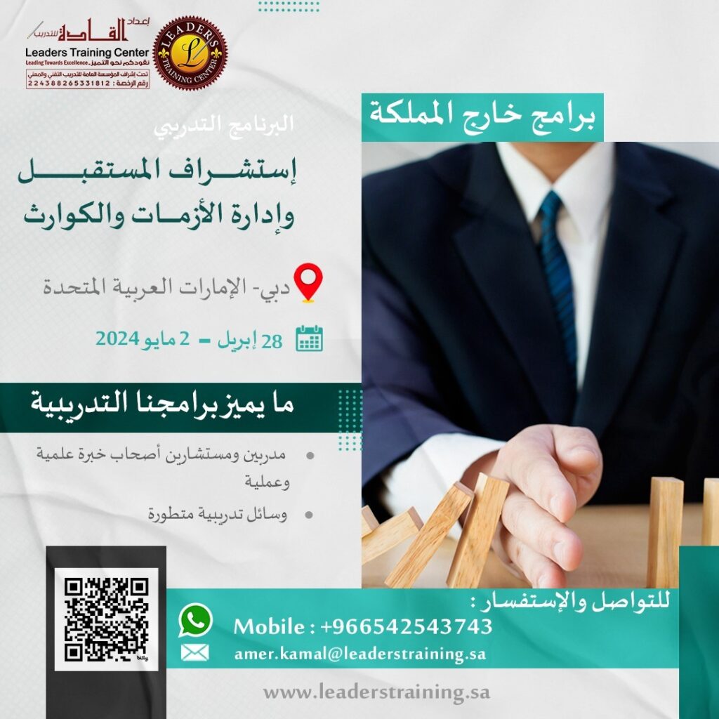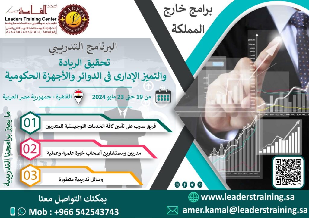 بقلوب مفعمة بالفخر والانتماء، وابتهاجاً بقرب قدوم اليوم الوطني للمملكة 🇸🇦 مركز إعداد القادة للتدريب يقدم لكم عرض مميز بمناسبة هذا اليوم المجيد: 🎓 الدبلوم التدريبي الشامل "الإدارة الإستراتيجية والتحول المؤسسي: وفق رؤية المملكة 2030" انطلق نحو القيادة وكن جزءاً من دفع عجلة التحول الوطني! هذا الدبلوم الفريد هو رحلتك المتكاملة لاكتساب أدوات العصر وأفضل الممارسات العالمية المتماشية مع طموحات رؤيتنا الغالية. ماذا يقدم لك هذا الدبلوم؟ 6 برامج نوعية تغطي أهم مجالات التطوير المؤسسي والقيادي: 🤖 قيادة التحول الرقمي للمدراء التنفيذيين (26 - 27 سبتمبر 2025) 💱 آليات تحقيق التوازن والشمول المالي(وفق رؤية 2030) (03 - 04 أكتوبر 2025) 💡 إدارة المعرفة كأداة للتميز المؤسسي والابتكار (10 - 11 أكتوبر 2025) ⚖ تطبيق الحوكمة الإدارية في الإدارات الحكومية (17 - 18 أكتوبر 2025) 📊 مؤشرات قياس الأداء KPIs (24 - 25 أكتوبر 2025) 👥 التحول من الدور التنفيذي إلى الدور الإستراتيجي في الموارد البشرية (31 أكتوبر - 01 نوفمبر 2025) المعلومات العامة : 🗓 المدة: 6 أسابيع (جمعة وسبت من كل أسبوع). ⏰ ميعاد الانطلاق: الجمعة 26 سبتمبر 2025. 🌐 مكان الإنعقاد : عن بعد (أون لاين). للاستفادة من الخصم المميز يشترط التسجيل قبل يوم ٢٣ سبتمبر لا تفوت فرصة الاستثمار في نفسك والإسهام في تحقيق رؤية وطننا الطموحة.